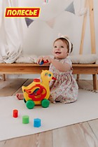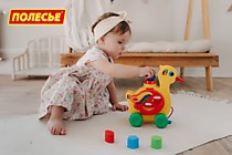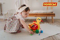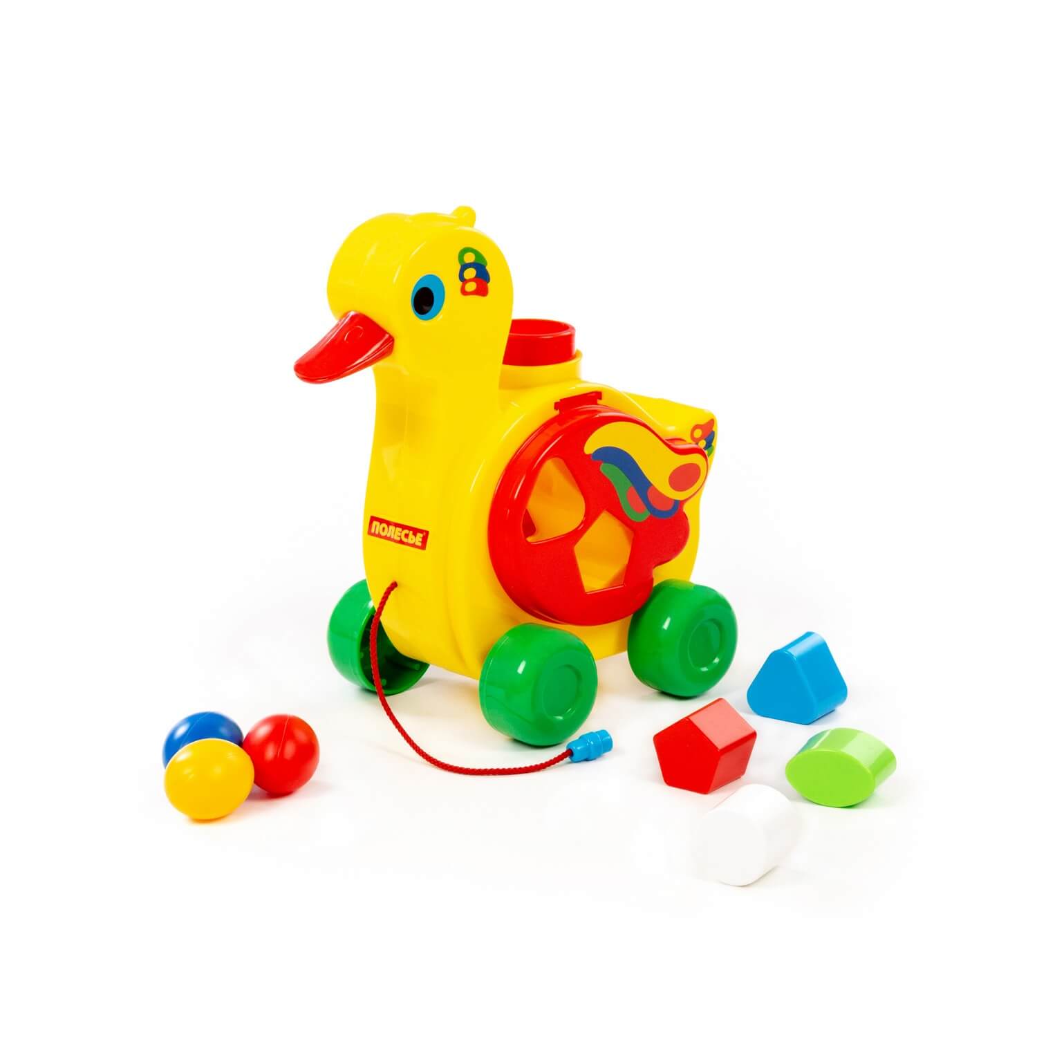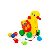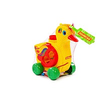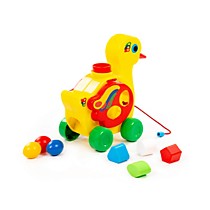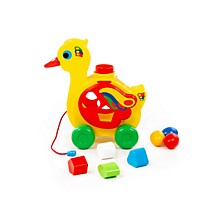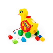 Уточка-несушка имеет яркую расцветку и объединяет в себе функции сортера и каталки. Наличие сортера позволяет ребёнку изучить форму и цвет, решая логическую задачу – подобрать отверстие для каждой фигурки. Возможность катать уточку делает игру еще интереснее, развивая при этом координацию движений малыша.
